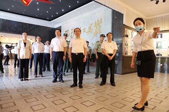 圖為吉安市軍地領(lǐng)導(dǎo)在烈士陵園聆聽講解員講述革命傳統(tǒng)。龍禮彬 攝