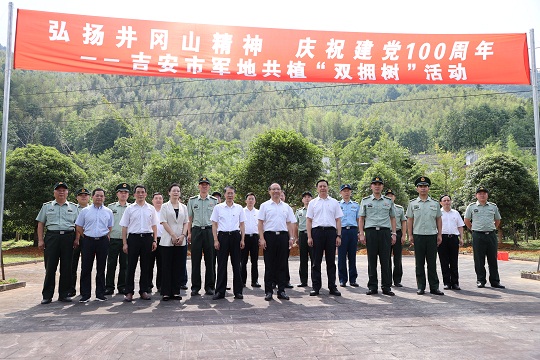 吉安市軍地領(lǐng)導(dǎo)在“雙擁林”前植樹合影。龍禮彬 攝