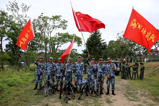 圖為中國參賽隊陸戰(zhàn)二班獲第三名后舉旗慶祝。肖勇利 攝