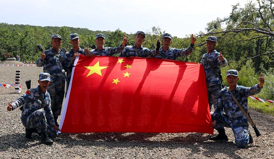 圖為中國參賽隊陸戰(zhàn)二班獲第三名后在賽場展開國旗留影。肖勇利 攝