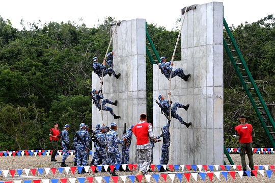 圖為中國參賽隊陸戰(zhàn)一班和三班跨越混凝土墻。肖勇利 攝