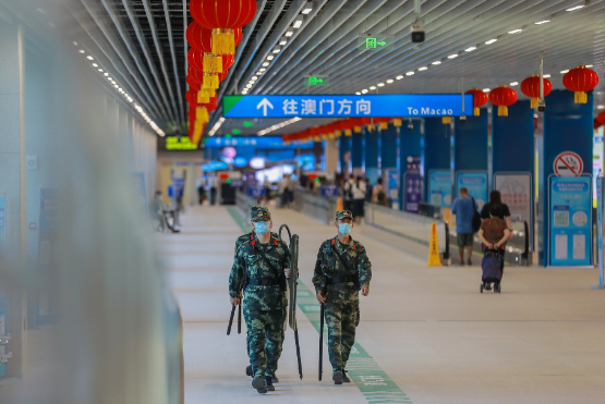國慶節(jié)期間,在廣東省珠海市青茂口岸熙熙攘攘的人潮中,全副武裝的武警廣東總隊執(zhí)勤第二支隊某中隊官兵格外醒目。據(jù)統(tǒng)計,作為粵澳旅檢通關新通道的青茂口岸,自9月8日正式開通上勤以來,中隊官兵累計為300余名跨境旅客提供問詢、送藥等服務。