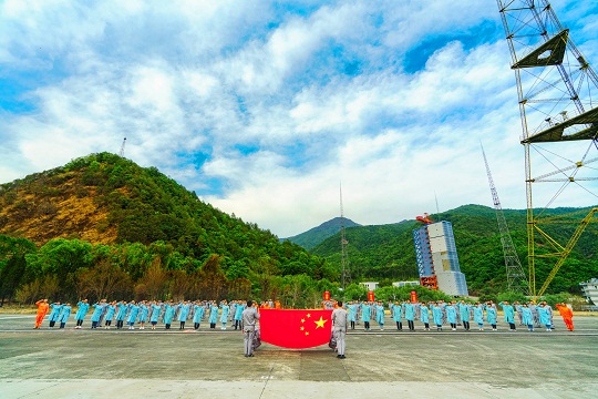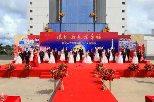 2020年10月1日,當(dāng)中秋遇上國(guó)慶,中心在西昌和文昌發(fā)射場(chǎng),為52對(duì)航天新人同步舉行“讓祖國(guó)見證幸?!奔w婚禮。