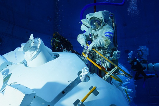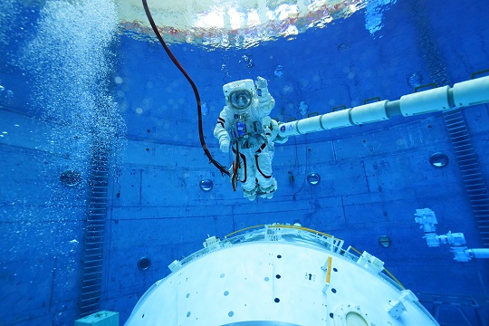 圖為如臨深空—2021年8月25日翟志剛水下訓(xùn)練在機(jī)械臂上移動(dòng)??追街?攝