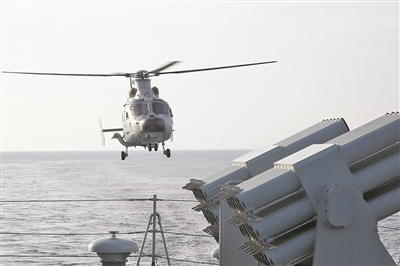 “上級(jí)通報(bào),我海區(qū)有‘?dāng)场瘽撏Щ顒?dòng),命我艦與直升機(jī)協(xié)同對(duì)其展開搜索與攻擊?!甭劻疃鴦?dòng),艦機(jī)迅速進(jìn)行協(xié)同訓(xùn)練。在直升機(jī)引導(dǎo)下,艦艇對(duì)水下潛艇展開有效攻擊……