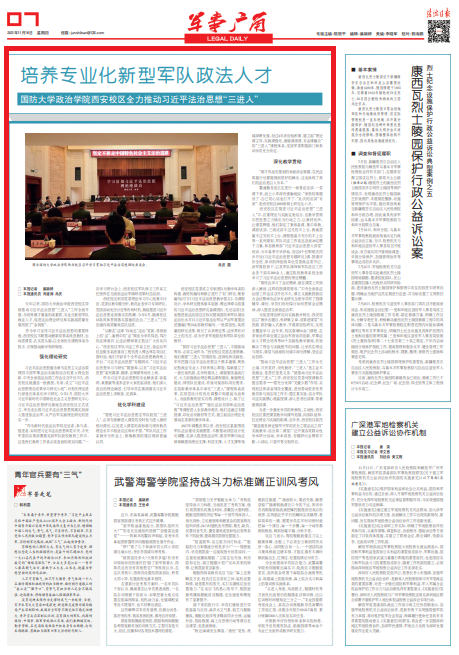 習(xí)近平法治思想蘊(yùn)含著馬克思主義法治原理同中國(guó)軍事法治實(shí)踐相結(jié)合的重大理論創(chuàng)新。中央全面依法治國(guó)工作會(huì)議召開后不久,西安校區(qū)就遴選一批教授、專家,成立“習(xí)近平法治思想理論成果學(xué)習(xí)研究小組”,對(duì)相關(guān)理論進(jìn)行深度化體系化學(xué)習(xí)研究。今年1月,國(guó)防大學(xué)習(xí)近平新時(shí)代中國(guó)特色社會(huì)主義思想研究中心習(xí)近平法治思想研究基地在西安校區(qū)正式成立,率先走出將習(xí)近平法治思想貫徹落實(shí)到深入推進(jìn)依法治軍、從嚴(yán)治軍實(shí)踐理論研究的堅(jiān)實(shí)一步。