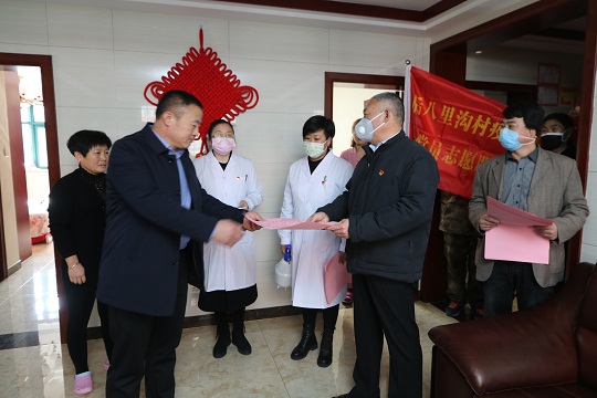 圖為后八里溝村黨委書記宋偉(右二)帶領(lǐng)黨員志愿服務(wù)隊入戶排查。