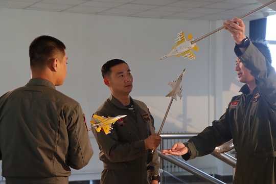 圖為海軍航空大學(xué)某基地組織地面演練,這是飛行教官丁陽(右一)正用飛機(jī)模型教授學(xué)員戰(zhàn)術(shù)動作。趙天淏 攝