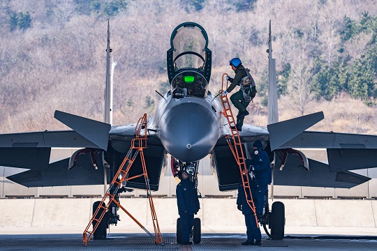 海軍航空大學(xué)某基地組織飛行訓(xùn)練,圖為飛行教官在機(jī)務(wù)人員的幫助下登上殲-15戰(zhàn)機(jī)。萬全 攝