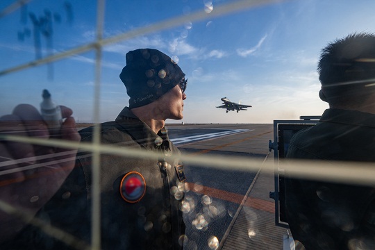 圖為海軍航空大學(xué)某基地艦載機(jī)飛行教官們在引導(dǎo)學(xué)員進(jìn)行陸基模擬著艦訓(xùn)練。萬全 攝