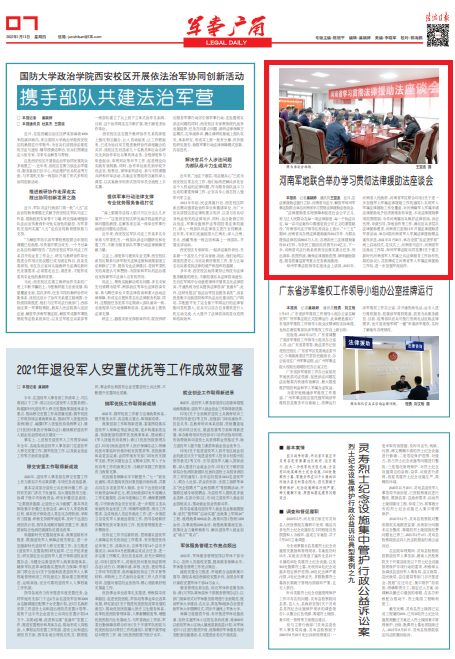 鄭州軍事法院領導在座談會上講到,2015年,河南省人民政府、河南省軍區(qū)聯(lián)合印發(fā)《關于進一步加強軍人軍屬法律援助工作的通知》,實現(xiàn)軍人軍屬法律援助工作全覆蓋,對河南籍軍人軍屬申請法律援助免予經濟困難條件審查,不設法律援助事項范圍限制;為非河南籍官兵做好法律咨詢、訴訟代理、申請引導、異地協(xié)作等工作,滿足官兵多層次法律援助需求。河南省已連續(xù)11年開展法律援助進軍營活動,舉辦6屆河南省軍人軍屬法律援助精品案件評選。2021年11月30日,承辦全國“憲法進軍營”線上啟動儀式,在儀式上,河南省司法廳、河南省軍區(qū)政治工作局、鄭州軍事法院共同簽署《關于建立新時代河南省軍人軍屬公共法律服務工作協(xié)作機制的協(xié)議》,并掛牌成立河南省軍人軍屬法律援助工作站,進一步加強軍地協(xié)作。