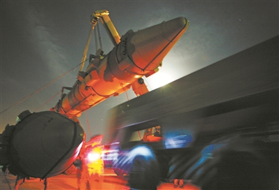 圖①:夜間吊裝導彈。