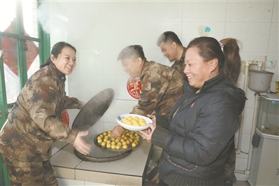 本報記者范奇飛(左一)與遼寧省營口軍分區(qū)幫扶工作隊在馮家堡村與村民一起蒸黏豆包,寓意生活蒸蒸日上。紀(jì)勝強 攝