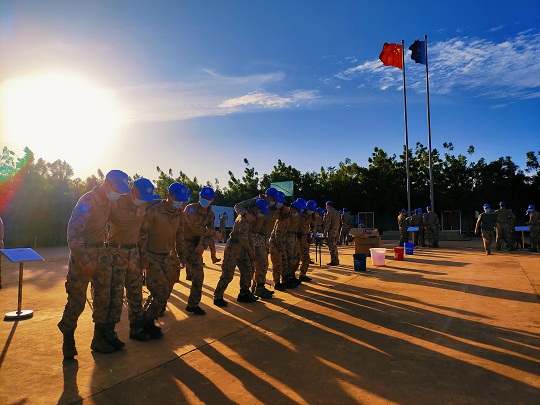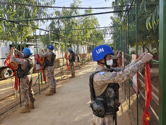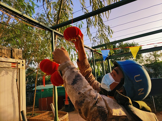 春節(jié)期間,中國第九批赴馬里維和工兵分隊組織春節(jié)期間氛圍營造。圖為官兵正在懸掛紅色的節(jié)日燈籠。王宏陽 攝