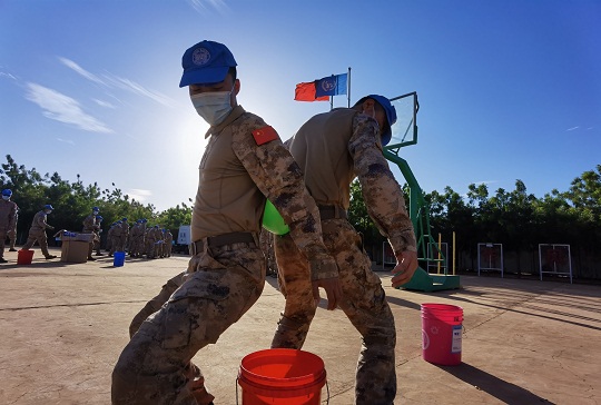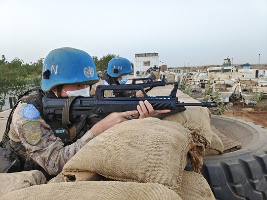 春節(jié)期間,中國第九批赴馬里維和工兵分隊組織了戰(zhàn)備演練。圖為營區(qū)警報響后,快反組迅速領(lǐng)取武器彈藥,占領(lǐng)預(yù)定位置,進(jìn)入嚴(yán)密戒備狀態(tài)。王宏陽 攝