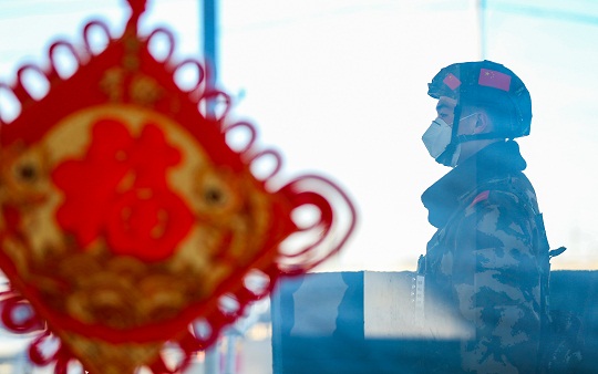 圖為武警執(zhí)勤官兵在某執(zhí)勤卡點(diǎn)定點(diǎn)執(zhí)勤。侯崇慧 攝
