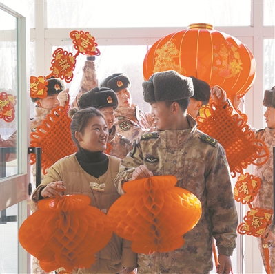 王萬果夫婦與連隊官兵一起貼春聯(lián)、掛燈籠,營造節(jié)日喜慶氛圍。
