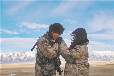 巡邏途中休息時,宣偉為妻子歐陽冬梅焐手取暖。