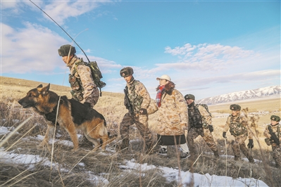 軍嫂歐陽冬梅跟著丈夫宣偉(左二)和戰(zhàn)友巡邏,體驗戍守邊關(guān)的艱辛。