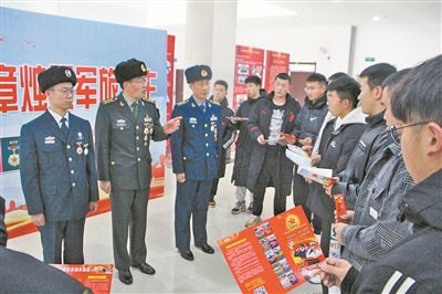 他們請功臣英模“把獎章證章戴起來”,參與征兵工作。軍分區(qū)依據(jù)相關規(guī)定,制訂了佩戴獎章證章細則,規(guī)范佩戴獎章證章的類型、方法和時機。從征兵宣傳、體檢政考、役前教育訓練,一直到審批定兵、新兵啟運等各個環(huán)節(jié),全軍分區(qū)67名榮立過軍功的現(xiàn)役和文職人員以及所屬干休所41名戰(zhàn)功卓著的離休老干部全程參與,與預征青年面對面,講述自己的從軍經(jīng)歷、成長過程和軍旅感悟。與此同時,他們要求各基層武裝部在為立功受獎官兵送喜報時,組織預征青年代表參加,舉辦“軍功章照耀軍旅人生”主題報告會、“功臣故事分享會”等活動。3年來,這個軍分區(qū)先后舉辦80多場主題報告會、故事分享會,以榮譽激發(fā)動力,讓榜樣催人前行。