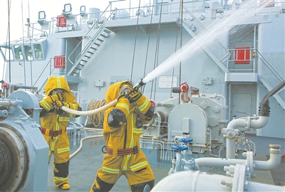 圖③:損管隊(duì)員開展滅火訓(xùn)練考核。