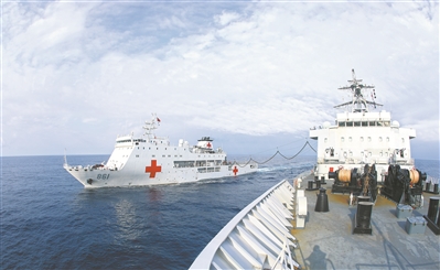 抵達(dá)補(bǔ)給海域后,醫(yī)療船快速占領(lǐng)補(bǔ)給陣位。官兵們?cè)谘a(bǔ)給艦和醫(yī)療船之間架起承載索,順利完成輸油軟管對(duì)接。海面波浪翻卷,艦船上下起伏,官兵克服困難精準(zhǔn)操縱,成功完成補(bǔ)給。