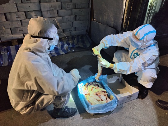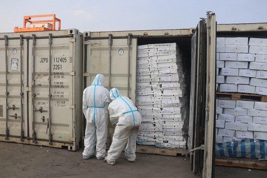 3月13日17時許,江門海警局根據(jù)情報獲悉,在江門市黃茅海對開海域有走私活動。該局立即派遣2艘執(zhí)法艇前往目標海域進行查緝。當日18時許,該局執(zhí)法員通過AIS在目標海域發(fā)現(xiàn)一艘可疑船只,遂即拉響警報,表明身份,責令可疑船只立即停船接受檢查。在可疑船只停船后,經(jīng)執(zhí)法員登臨檢查發(fā)現(xiàn),該船舶上裝載有29個長20英尺的集裝箱,集裝箱中載有大量凍品,凍品外包裝上均有明顯的外文標識,由于天氣炎熱且船上沒有任何冷鏈保存裝置,部分凍品已出現(xiàn)腐敗發(fā)臭跡象,隨船未發(fā)現(xiàn)該批凍品任何合法來源和檢驗檢疫證明,執(zhí)法員隨即將涉案船舶及所載凍品依法進行查扣。