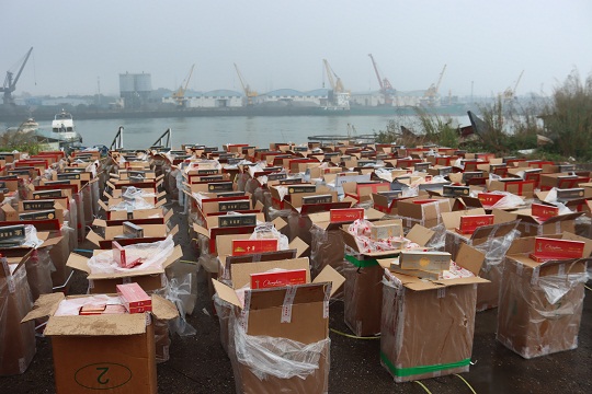 在其中一起案件中,該局巡邏艇在潿洲島以南附近海域巡邏時(shí),發(fā)現(xiàn)一艘形跡可疑的灰色鐵殼船,執(zhí)法員根據(jù)經(jīng)驗(yàn)判斷,該船有可能正從事非法走私活動(dòng),隨即對(duì)其喊話,要求停船接受檢查。經(jīng)依法登臨檢查,發(fā)現(xiàn)船上載有凍牛肉一批,且無(wú)合法手續(xù),執(zhí)法員遂依法對(duì)該批貨物及涉案人員、船舶進(jìn)行扣留作進(jìn)一步調(diào)查。經(jīng)清點(diǎn),該船上裝載涉嫌走私凍品80余噸,案值約400萬(wàn)元。