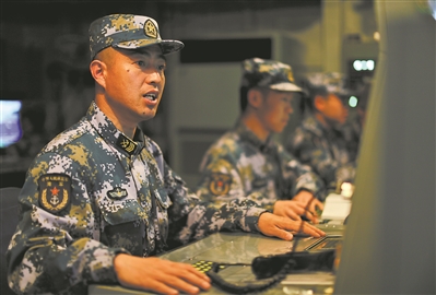 水下威脅剛解除,一場(chǎng)對(duì)空防御戰(zhàn)斗又緊急打響。編隊(duì)指揮室內(nèi),“敵情”態(tài)勢(shì)實(shí)時(shí)更新,一道道指令快速傳至各戰(zhàn)位。在煙幕掩護(hù)下,編隊(duì)各艦快速機(jī)動(dòng)規(guī)避,組成對(duì)空防御隊(duì)形,利用副炮抗擊來襲導(dǎo)彈。