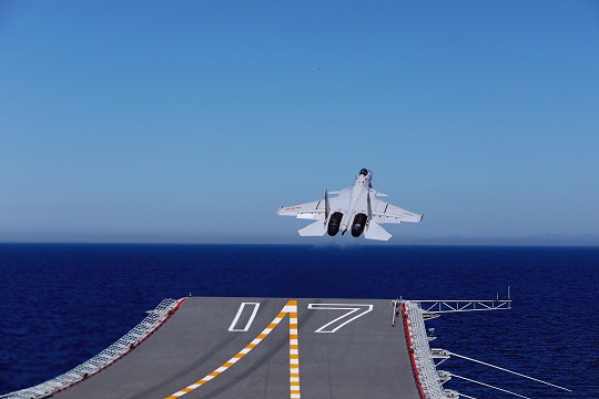 圖為殲—15艦載戰(zhàn)斗機從山東艦滑躍起飛。