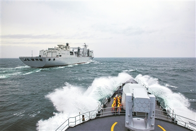 海面威脅解除,編隊又展開航行補給訓練。此時,海況更加惡劣,艦艇在波峰浪谷間搖擺起伏。官兵們克服困難,齊心協(xié)力投入訓練。