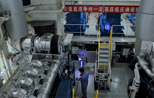 圖為輪機(jī)部門船員進(jìn)行設(shè)備檢修。