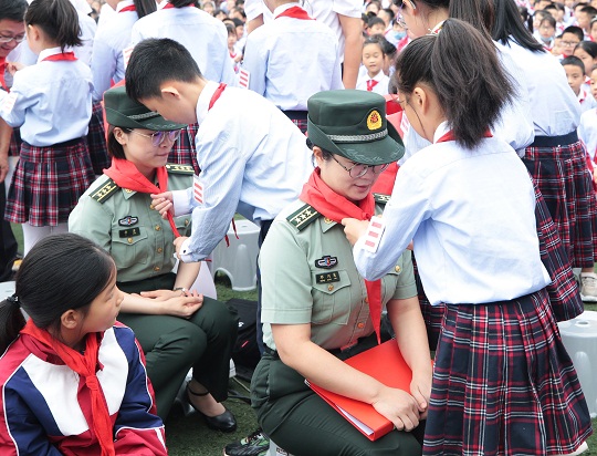 圖為2021年,孩子們?yōu)橘Y助自己的某部官兵系上紅領(lǐng)巾。朱一韜 攝