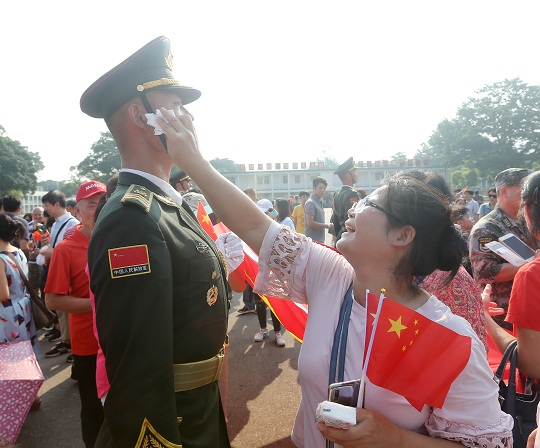 圖為香港市民為儀仗隊(duì)官兵擦汗。易定 攝
