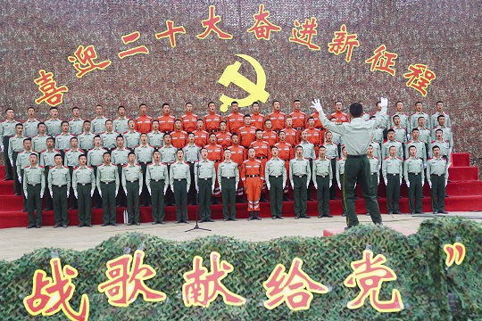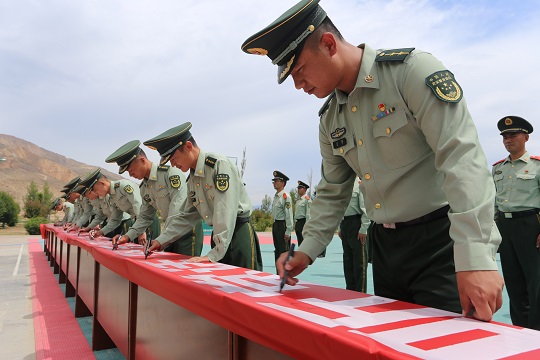 武警青??傟?duì)機(jī)動(dòng)二支隊(duì)演訓(xùn)場(chǎng)上,官兵們跨彈坑、攀云梯、翻高墻……突然一聲哨響:全體集合!大家集體重溫入黨誓詞。之后,官兵在寫有“永遠(yuǎn)聽黨話,堅(jiān)定跟黨走,喜迎二十大,奮進(jìn)新征程”的橫幅上寫下自己的名字。