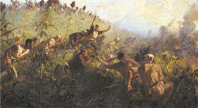 青紗帳里游擊隊員逞英豪(油畫)韋啟美 作