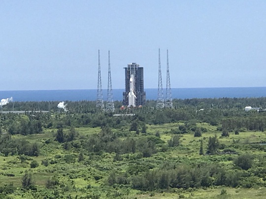 高大雄偉的發(fā)射塔架前,重約849噸、高約53.7米的“龐然大物”長征五號B遙三運(yùn)載火箭蓄勢待發(fā)。