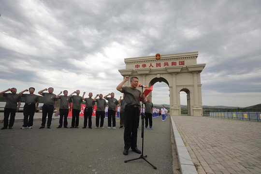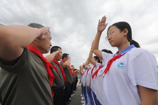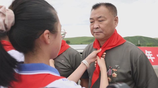 國(guó)門(mén)之下,革命老兵高舉右拳,神色堅(jiān)毅,鏗鏘有力的誓言發(fā)自肺腑,“我志愿加入中國(guó)共產(chǎn)黨,擁護(hù)黨的綱領(lǐng),遵守黨的章程……”一字一句,莊嚴(yán)而神圣,面對(duì)鮮紅的黨旗,他們?nèi)詧?jiān)守著幾十年前宣誓時(shí)的那顆初心,他們把自己的“紅色芳華”,獻(xiàn)給了革命事業(yè)。深受感動(dòng)的學(xué)生們用最真摯的情感唱響紅歌,用最崇高的敬意為革命老兵戴上紅領(lǐng)巾,革命老兵也回敬標(biāo)準(zhǔn)的軍禮,承載著初心和使命的革命精神跨越時(shí)空,根植在學(xué)生們的心中?!皞鞒惺亲詈玫闹戮?,學(xué)生們只有堅(jiān)守初心,傳承老一輩革命精神,好好學(xué)習(xí),做一個(gè)對(duì)國(guó)家有用的人,才能不負(fù)重托、不負(fù)期盼。”烏蘭浩特市第五中學(xué)教師王向英表示。