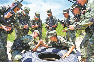圖①:兄弟二人在戰(zhàn)友吶喊聲中進行小比拼。圖②:訓練結束后,兄弟倆經(jīng)常交流心得。鄧居山 吳昊宇 攝影報道