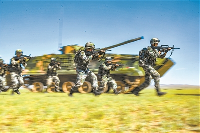 圖為第73集團軍某旅“紅四連”高擎先輩用熱血浸染的旗幟,不斷沖鋒。圖為該連官兵在野外進行步戰(zhàn)協(xié)同訓練。劉志勇 攝