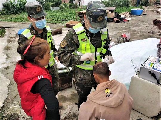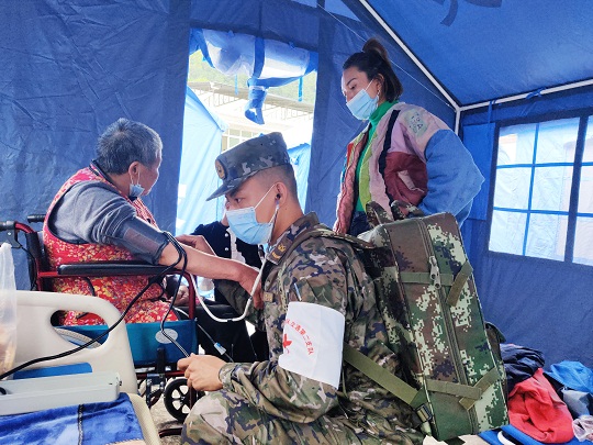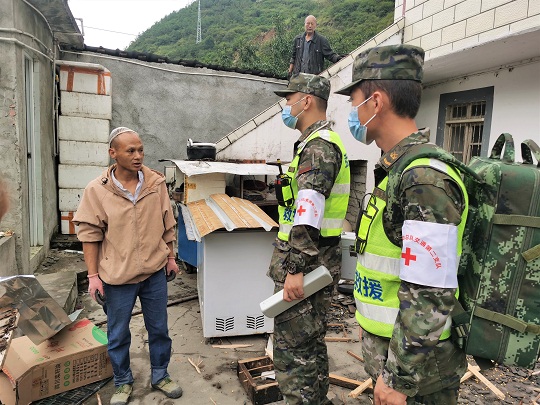 圖為武警官兵為受災群眾開展醫(yī)療巡診工作。