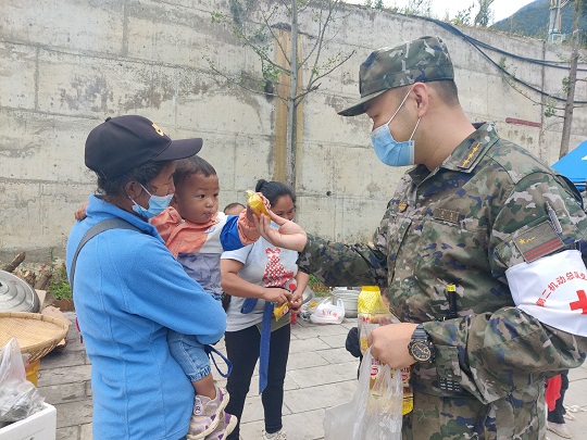 圖為武警官兵為受災群眾分發(fā)食物和水。