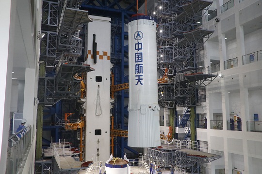 長七A火箭一進場,試驗隊隊員就忙得熱火朝天,大家正在將水平躺著的火箭豎立起來進行總裝。在垂直總裝及單元測試階段,試驗隊通過改進總裝模式,將總裝時間縮短了3天。
