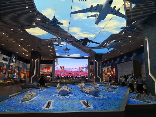 圖為“領(lǐng)航強(qiáng)軍向復(fù)興——新時(shí)代國防和軍隊(duì)建設(shè)成就展”展廳。