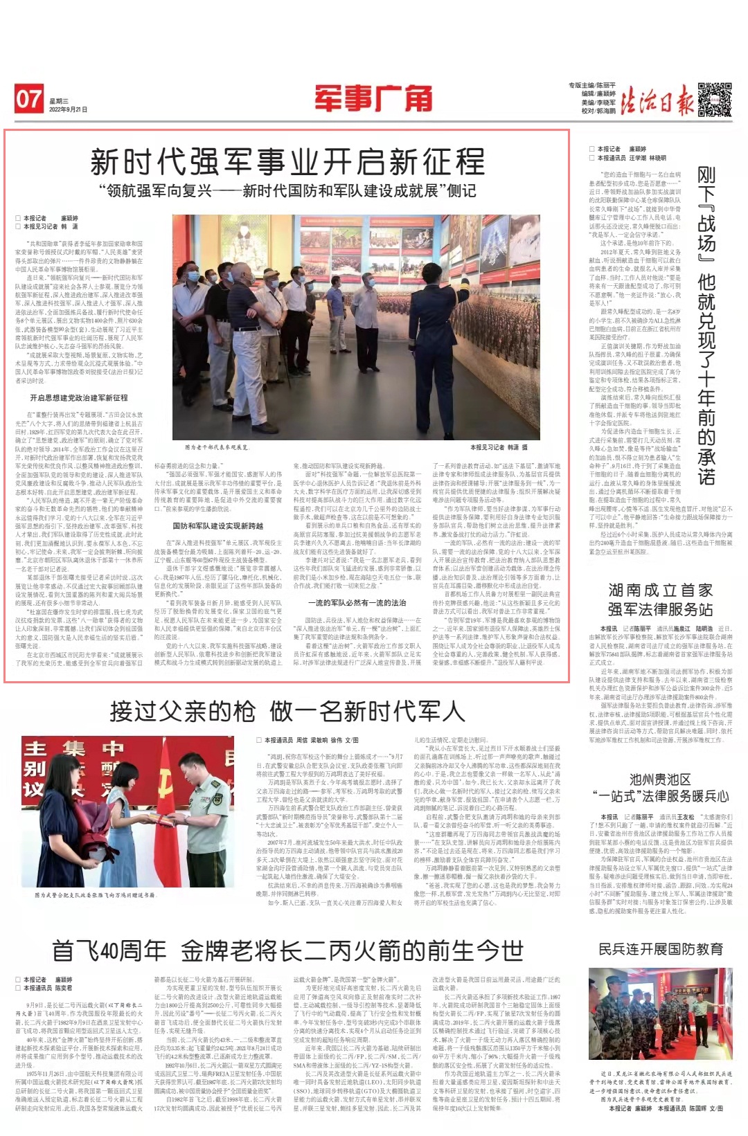 一流的軍隊(duì),必然有一流的法治;建設(shè)一流的軍隊(duì),需要一流的法治保障。黨的十八大以來,全軍深入開展法治宣傳教育,把法治教育納入部隊(duì)思想教育體系;以法治軍營創(chuàng)建活動(dòng)為載體,在法治理念傳播、法治知識(shí)普及、法治理論引領(lǐng)等多方面著力,讓官兵在耳濡目染、潛移默化中形成法治自覺。