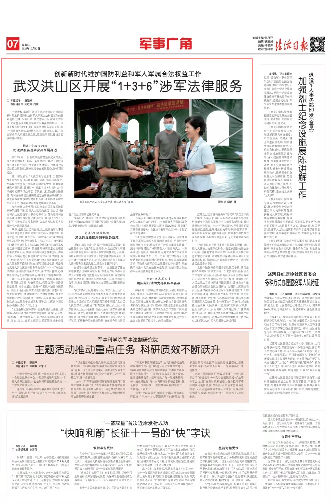 一封維權(quán)求助信,開啟了湖北省武漢市洪山區(qū)新時代維護國防利益和軍人軍屬合法權(quán)益工作的探索創(chuàng)新之路。今年以來,武漢市洪山區(qū)在湖北省軍區(qū)、武漢警備區(qū)和解放軍武漢軍事法院的指導下,開展了極具特色的“1+3+6”涉軍法律服務(wù)試點工作,即1個司法服務(wù)網(wǎng)絡(luò)、3項協(xié)作機制、6件惠軍實事,在依法解決軍人軍屬后顧之憂、服務(wù)駐軍部隊建設(shè)方面取得良好成效。