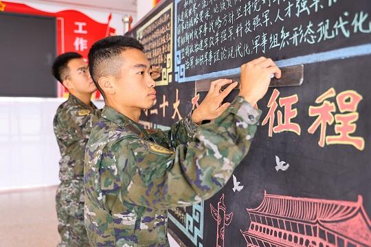 圖為官兵正在進行“贊頌十年成就,奮進新時代”板報創(chuàng)作。