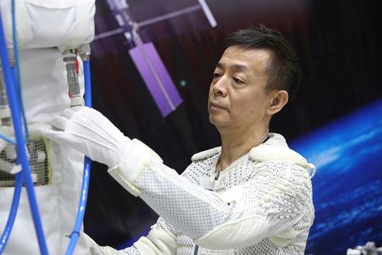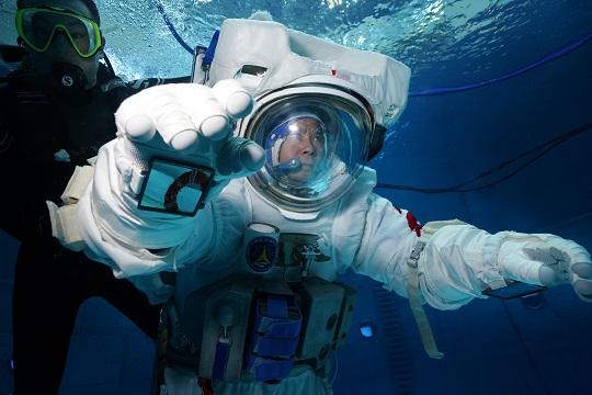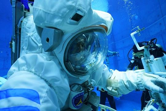 在圓形的模擬失重水槽中,航天員穿著數(shù)百公斤的水下服懸浮在藍(lán)色深水中。水下訓(xùn)練服相當(dāng)于一個(gè)“人”形飛船,是個(gè)鋼性結(jié)構(gòu),張陸的肩比較寬,每次把自己的兩只胳膊塞進(jìn)服裝里或者出服裝,都要費(fèi)盡九牛二虎之力。在水里一待就是五六個(gè)小時(shí),整個(gè)人的四肢被固定在水下服里,癢了痛了都只能咬牙堅(jiān)持,餓了渴了只能喝水。