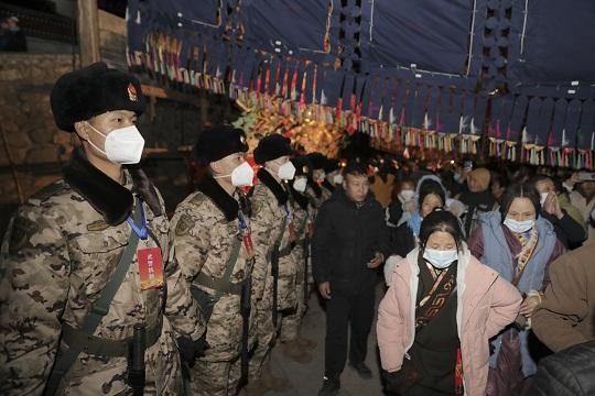 圖為武警青??傟?duì)官兵在塔爾寺酥油花展期間堅(jiān)守崗位、認(rèn)真執(zhí)勤。