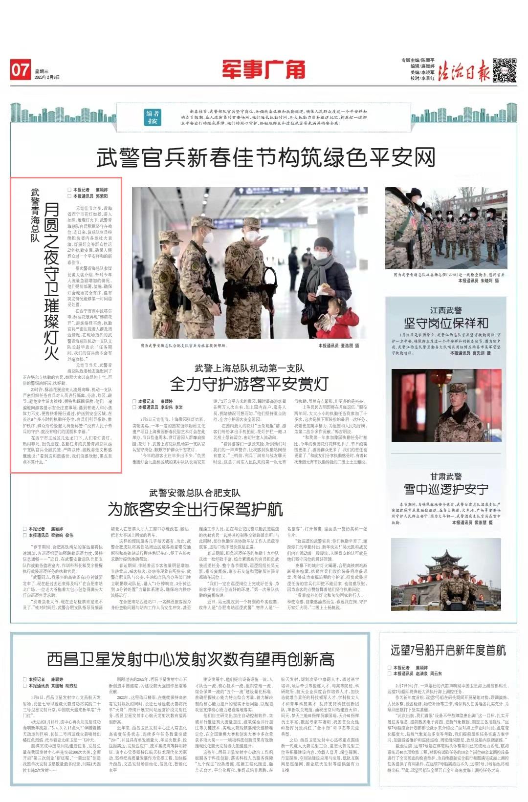 在西寧市主城區(qū)幾處龍門(mén)下,人們看燈賞燈,熱鬧非凡,擔(dān)負(fù)巡邏、備勤任務(wù)的武警青海總隊(duì)西寧支隊(duì)官兵全副武裝,嚴(yán)陣以待。副政委張文彬感慨地說(shuō):“看到這和諧盛世,我們倍感欣慰,累點(diǎn)苦點(diǎn)不算什么。”